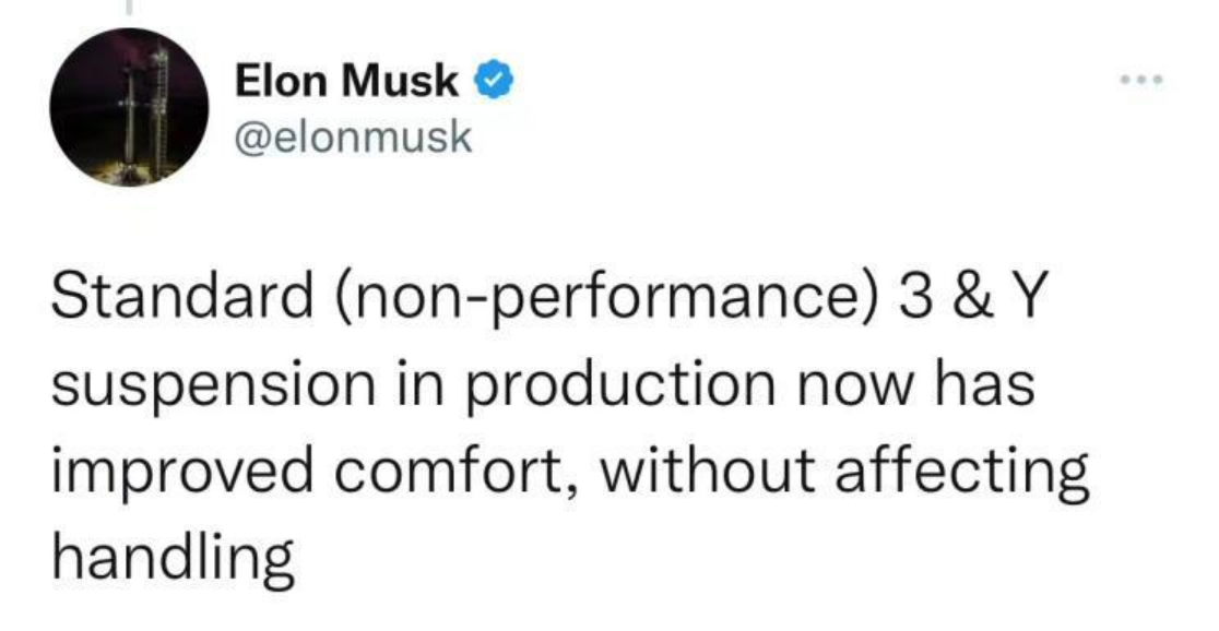 10月18日,马斯克近日在社交媒体上表示,将调整特斯拉Model 3和Model Y车型的悬架舒适性,并且不会影响驾驶操控。一直以来,特斯拉Model 3和Model Y一直是一款注重驾驶操控的车型,优秀的悬架支撑性带来很强的车身跟随性与动态极限,整车的运动性能很强,但对于普通用户并不友好。