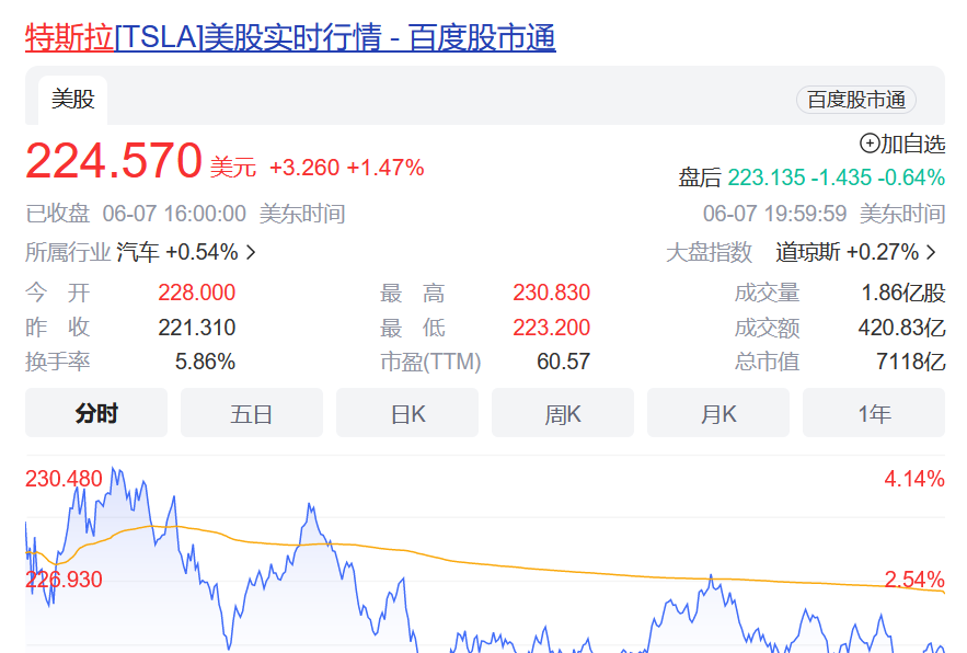 6月7日,特斯拉的股价在纽约收盘上涨1.5%,至224.57美元,连续第九天上涨,也是自2021年1月以来最长时间的连续上涨。尽管特斯拉的股价最近有所下跌,但今年以来已经上涨了82%,从去年65%的跌势中强势反弹。