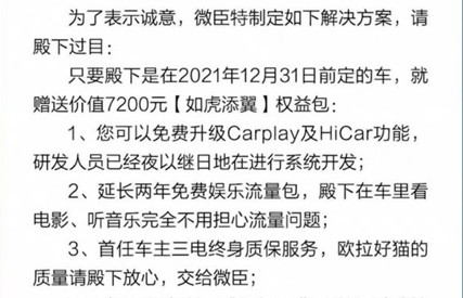 实际上,在此次“换芯门”被曝出时,欧拉好猫曾针对该事件发表过声明,彼时,欧拉表示目前正在销售的欧拉好猫车型2020年11月上市,车机确实尚未配置高通八核芯片。而宣传中所标注的高通八核心片,则是准备未来在车型中所使用的。同时声明中也给出了相应的补偿政策,赠送价值7200元【如虎添翼】权益包。