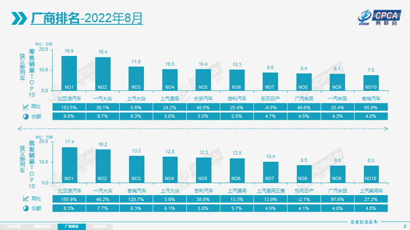 车企视角,比亚迪以16.9万辆的零售量力压南北大众,153.5%的增速也超过了其他所有车企。另外,长安和吉利的零售量分别达到了10.4万、10.3万辆,仅次于上汽通用的10.5万辆,位列第五、第六位。