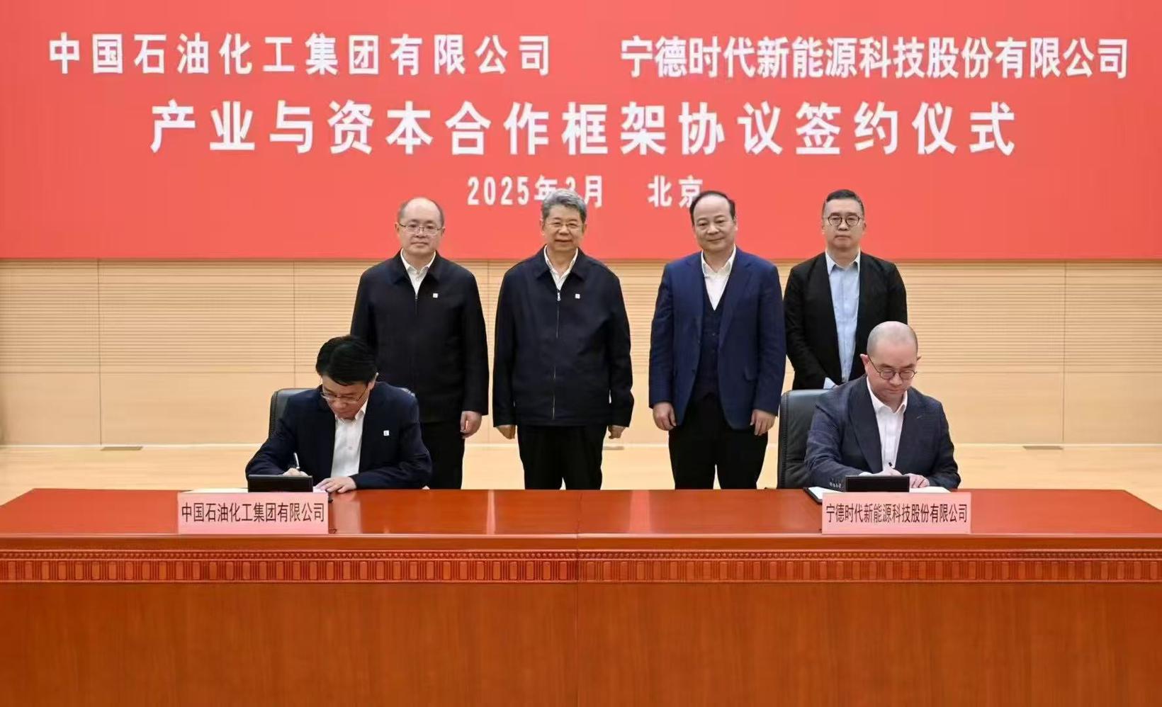 宁德时代董事长兼CEO曾毓群与中国石化董事长、党组书记马永生,宁德时代首席投资官王红波,中国石化总经理、党组副书记赵东进行座谈并一同见证签约。