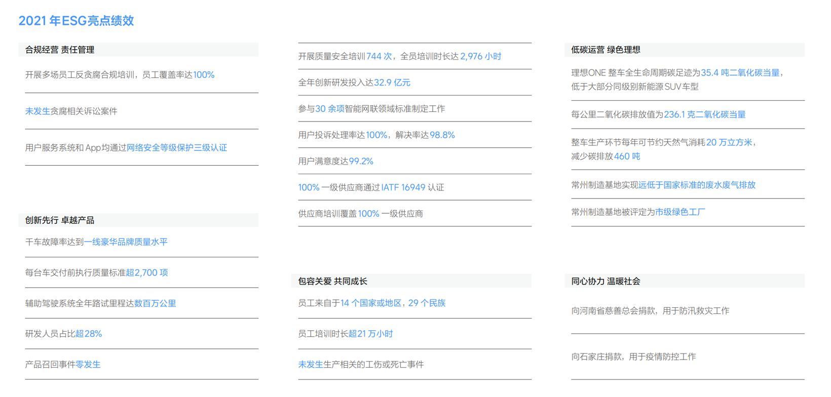 4月19日,理想汽车发布了首份环境、社会和管治(ESG)报告,首次披露了企业在绿色运营、创新产品、合规管治、包容关爱、温暖社会五个方面取得的成绩。