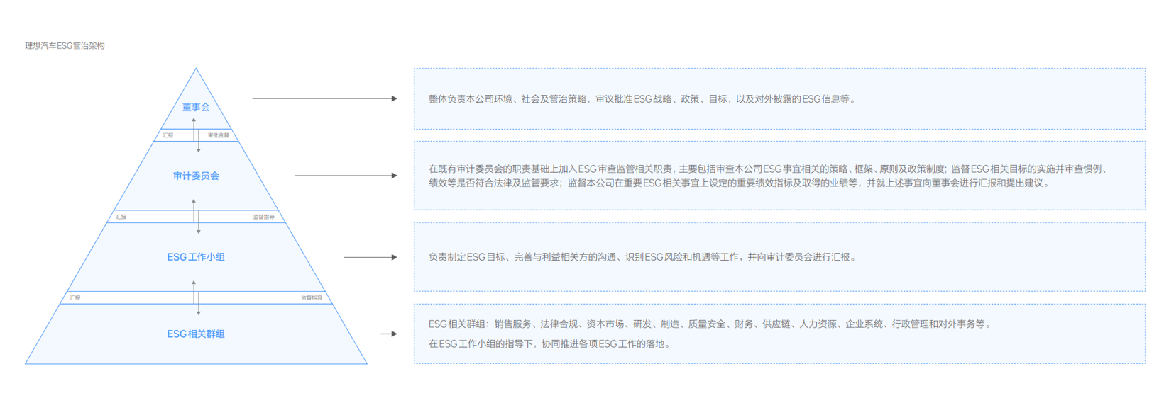理想汽车在ESG报告中提到,2021 年,理想汽车进一步提升了对ESG的重视,并设立ESG工作小组统筹ESG相关事务。另外,理想计划在2022 年设立ESG委员会,持续为企业推动ESG管理提供强有力的组织保障。