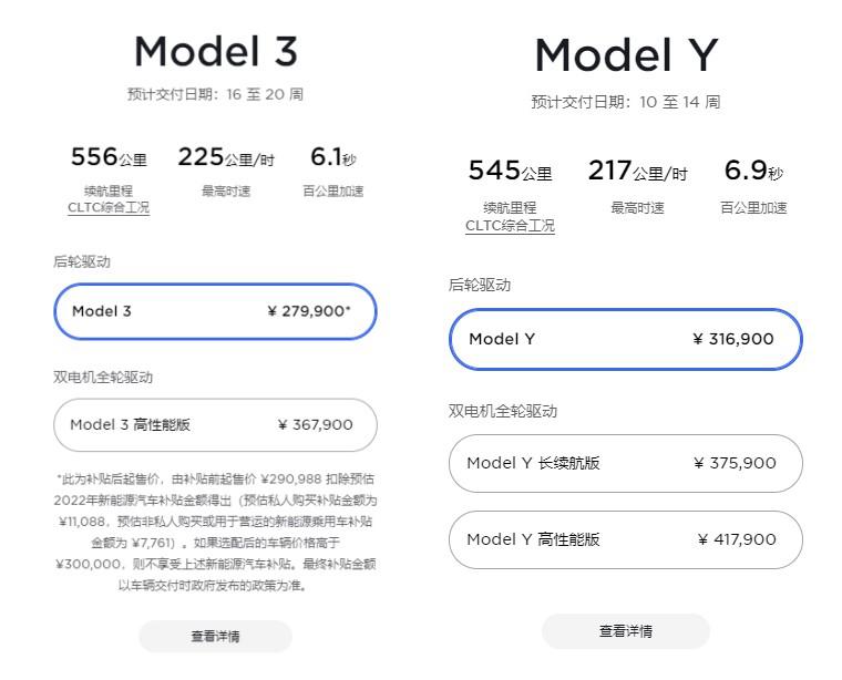Model 3与Model Y最新价格;图片来源:特斯拉官网截图