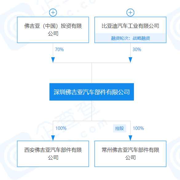 企查查股权穿透显示,该公司为深圳佛吉亚汽车部件有限公司全资控股,后者由佛吉亚、比亚迪共同持股,股权占比70%:30%。
