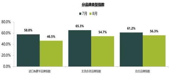 从品牌库存预警指数看:8月份进口&豪华品牌、主流合资、自主品牌指数环比均有不同程度下降。在消费升级换购和豪华车价格下探双重驱动下,豪华品牌库存指数进入景气区间。自主品牌在汽车下乡政策的推动下销量上升,但库存压力仍然较大。