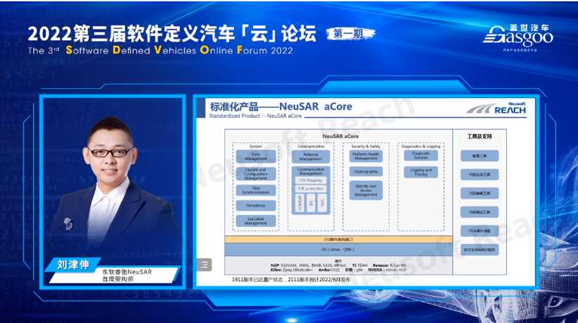 在云论坛中,东软睿驰NeuSAR首席架构师刘津伸分享了其公司针对域控制器的软件开发平台——NeuSAR DS(Domain System)。这款产品可为智能汽车的开发提供更高效的软件开发平台、以及更完整的基础软件解决方案。