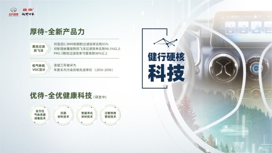 依托于国内唯一的千人规模越野车研究院,北京越野在最短时间内突破了CN95级高效过滤、低气味低VOC材料两大核心技术。“健行方舟”所搭载的CN95级高效过滤技术,可有效阻隔PM2.5以及新冠病毒飞沫,效率分别达98%和98.5%,相当于为汽车戴上了口罩;同时,北京越野也成为了第一家经认证的CN95过滤净化技术的越野车企业。同时,北京越野还在“全方位气体杀菌消毒”、“抗菌材料”、“智能净化材料”、“过敏物质管控”等深度健康应用上持续投入研发力量,一个更加绿色、健康的旅途来日可期。