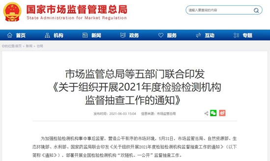 5月31日,市场监管总局、自然资源部、生态环境部、水利部、国家药监局等五部门,联合印发《关于组织开展2021年度检验检测机构监督抽查工作的通知》,部署开展全国检验检测机构“双随机、一公开”监督抽查工作,加强事中事后监管。