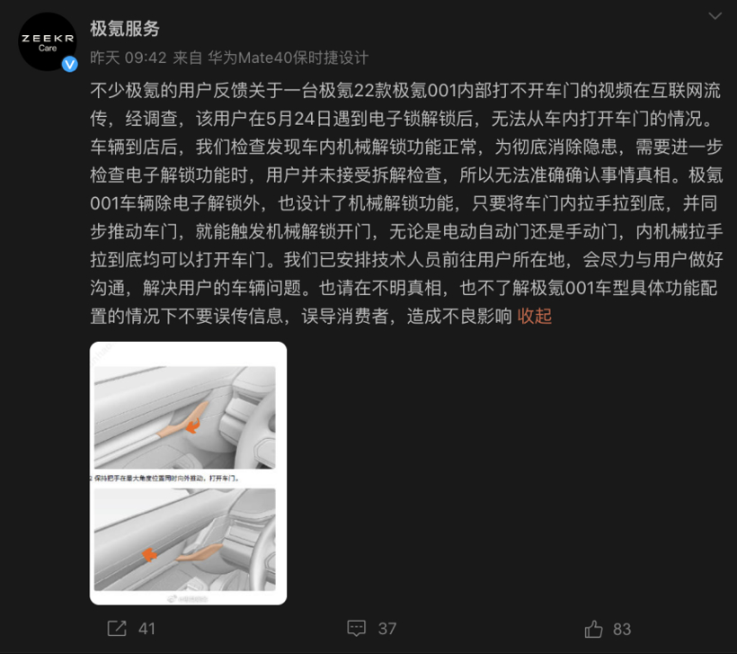 极氪官方也随即进行了回应,表示车内机械解锁功能正常,但需进一步检查电子解锁功能。