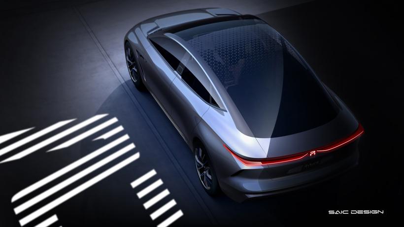 概念车尾部采用贯穿式灯带设计,高度集成、大美从简;一片式尾灯由中央R标放射延伸,表达属于高端纯电旗舰的科幻高能、纯粹自信;扁平化灯带表达出年轻化、运动化的设计定位,表面交错的流体花纹和LOGO处内收的曲线共鸣呼应,运动感跃然眼前,一展新品牌形象积蓄的强大能量。