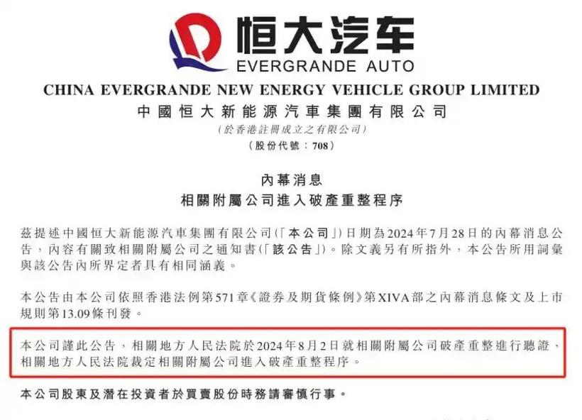 而早在2024年7月28日晚间,恒大汽车公告,其附属公司恒大新能源汽车(广东)有限公司申请破产重组,其中就涉及位于广州南沙的工厂。