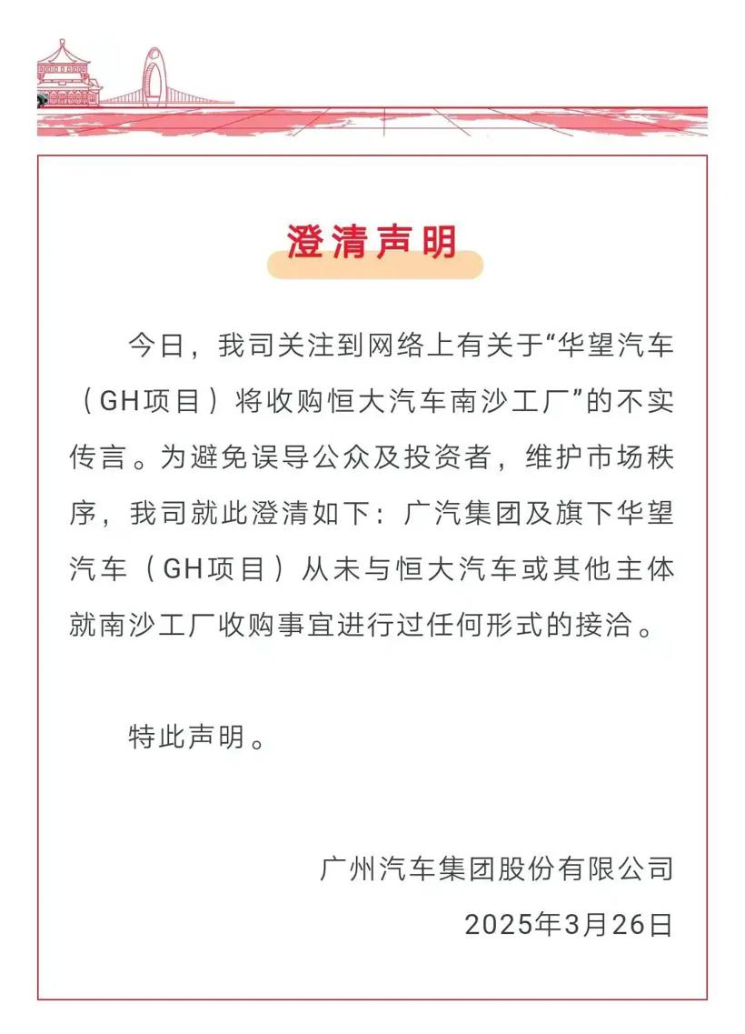 所以,广汽方面很快就进行了辟谣。内容显示,广汽集团及旗下华望汽车(GH项目)从未与恒大汽车或其他主体就南沙工厂收购事宜进行过任何形式的接洽。