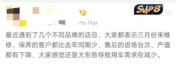 一位汽车博主走访多家不同品牌4S店后发现,三月份来店维修、保养的客户数量较去年同期大幅减少,售后的进场台次和产值均有所下降。