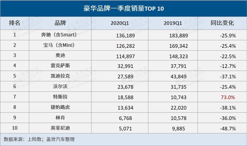 乘联会数据显示,一季度狭义乘用车综合销量为301.4万台,同比下降40.8%。此种情况下,豪华车市场虽然整体跑赢了市场大盘,但依旧未能逃脱全线下跌的命运。暖心车管家通过整理保监会上险数据,得出一季度在华终端销量排名前十的豪华品牌。这一排名彰显如下两个明显趋势,一是一线豪华品牌整体下跌,但奔驰、宝马领先趋势明朗;二是特斯拉入围,或将对二线豪华品牌造成威胁。