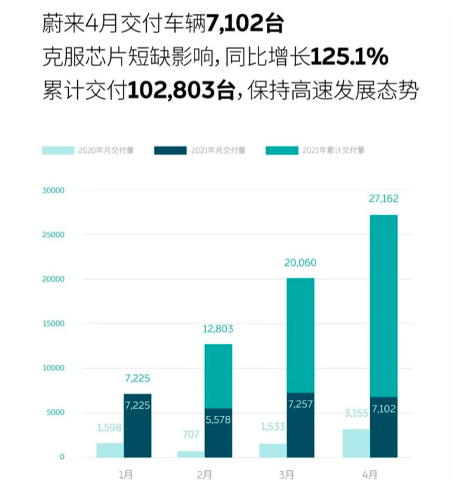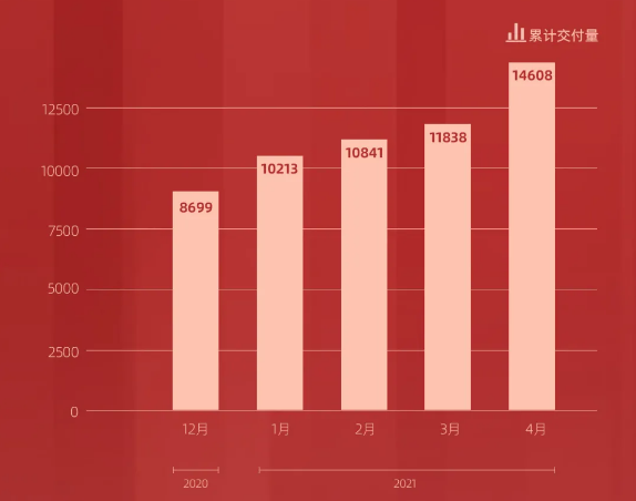蔚来汽车4月交付量达7,102台,同比增长125.1%,环比下降2%。环比下降的主要原因,蔚来在Q1财报电话会议中作了说明,“3月底4月初,受芯片短缺影响,江淮蔚来工厂暂停了五个工作日的生产,这对我们4月份的生产和交付产生了一定负面影响。二季度,全供应链的整体产能仍将持续面临巨大的挑战,但蔚来将与合作伙伴一起在全力以赴保证供应。”