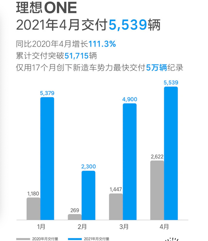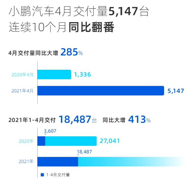 小鹏汽车4月总交付量5,147台,较去年同期大增285%,已连续10个月实现同比翻番。其中,P7交付量2,995台,G3交付量2,152台。截至2021年4月底,小鹏本年度累计交付量已达18,487台,为去年同期五倍。