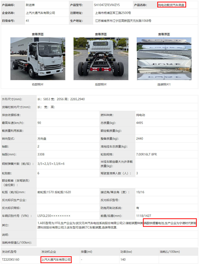 另外注意到,对于上汽轻卡申报的2款纯电动轻卡底盘,虽然存在着能否换电的差异,但从核心部件的匹配来看,SH1047ZFEVMZY6选择精进电机(TZ220XSA03)+远景动力磷酸铁锂电池,SH1047ZFEVMZY5选择上汽大通(TZ220XS160)+宁德时代磷酸铁锂电池,能够看出在产品匹配方面,相关企业以多元化的匹配方式,为用户寻找着最佳的组合方案,以降低用户的购置成本。