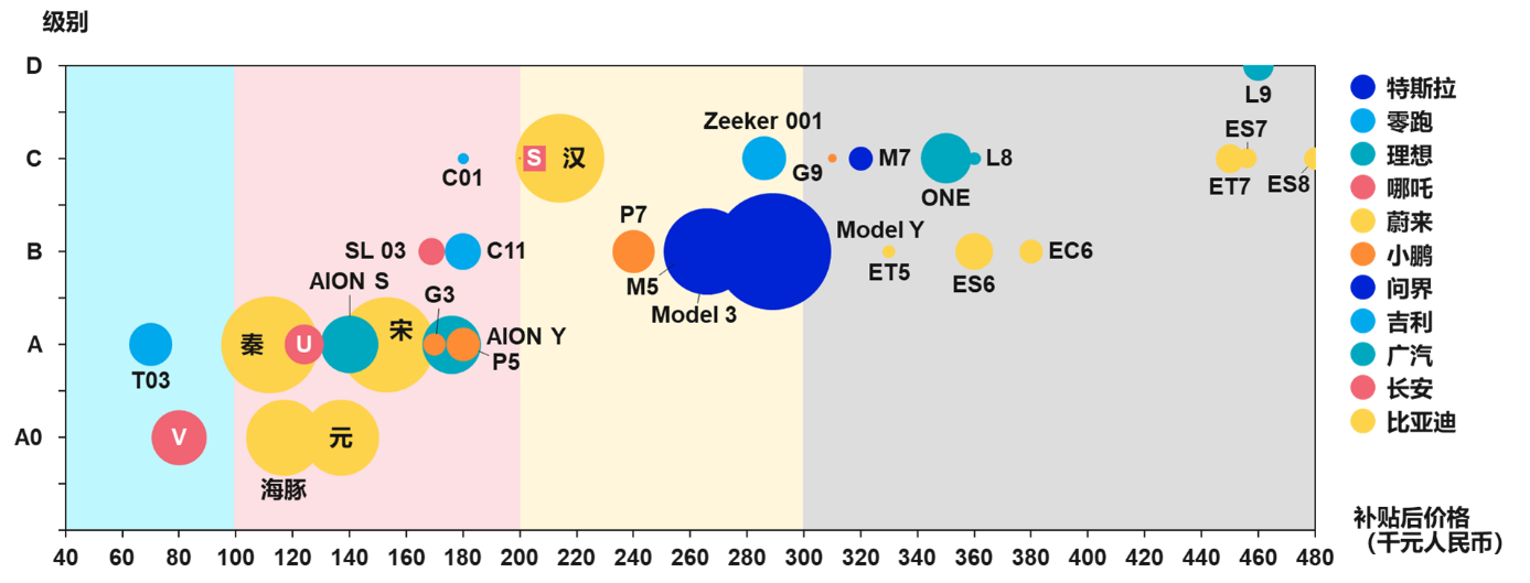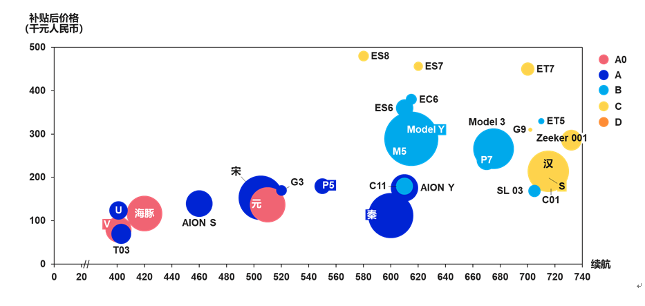 在10万元以下的价格区间内,哪吒汽车的V和零跑汽车的T03,还具有些许优势,为他们赢下了一席之地。而到了10-20万的价格区间内,轴距2.7米,续航里程400-500公里已经是比亚迪和广汽埃安主力车型的基本配置。零跑C11和小鹏P5依靠着轴距和续航里程上的优势,还维持着一定的销量。但是随着长安深蓝SL03的上市,这些优势预计也将趋缓。