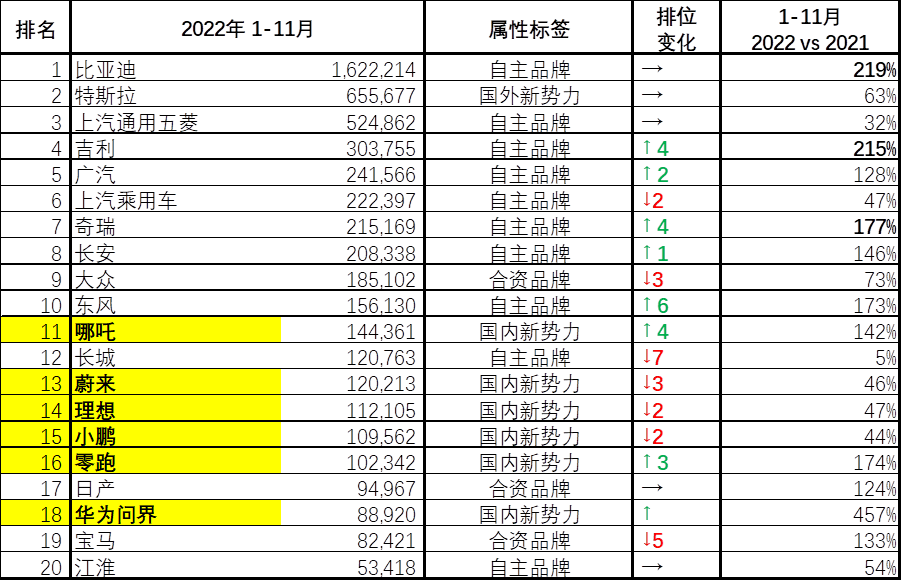 从排名来看,比亚迪、特斯拉和上汽通用五菱依然霸榜前三,令我们意外的是,中国造车新势力排名都在10名之外,排名最高的是位列11的哪吒,而蔚小理三家都出现了排名的下滑。
