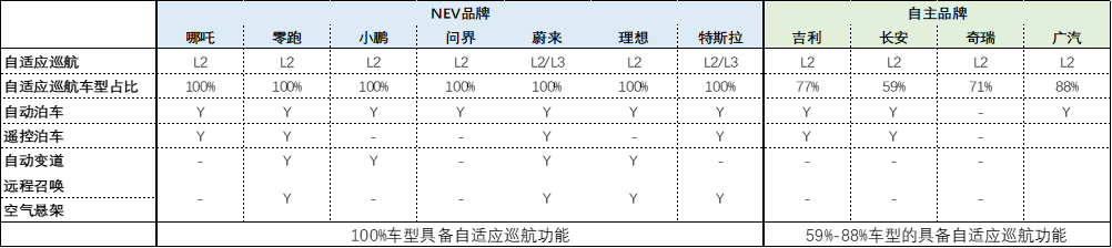 其次,在自动驾驶功能的应用上,中国造车新势力更多搭载了(号称)L2,以及L2+以上功能的自动驾驶,其中不乏自动泊车、自动变道等功能。而许多自主品牌在这方面会稍显逊色。