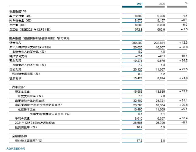3月15日,大众汽车召开了2021年财报新闻发布会。会上发布的信息显示,2021财年大众集团整体销量较2020财年减少约60万辆(共计售车860万辆),同比下降6.3%,较2019财年减少240万辆。销量虽然出现下滑,但2021财年大众集团的销售收入却实现了12%的增长,达到2502亿欧元。未计入特殊项目支出的营业利润为200亿欧元,增长接近翻倍。