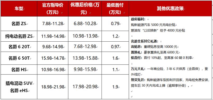 值此“双节合一”的有爱时刻,名爵以大手笔购车补贴感恩回馈广大消费者,送上超值大礼包。具体如下:1、万元大礼——在现有优惠政策基础上,额外再享价值至高10000元大礼包,包含商业险、多次免费保养等;2、想买先开——购新能源车型即刻开回家,充电桩免费安装,提车后30天内完成上牌(逾期享补偿)。为积极回馈消费者的热爱,名爵在此次购物节之前,已启动“33亿巨额红包”等一大波福利,涵盖全系车型,为车市持续注入爵佳活力。